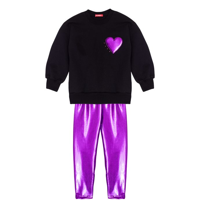 Μαύρη μπλούζα με καρδιά και εντυπωσιακό μεταλλιζέ μωβ κολάν, για ξεχωριστές εμφανίσεις με στυλ!
